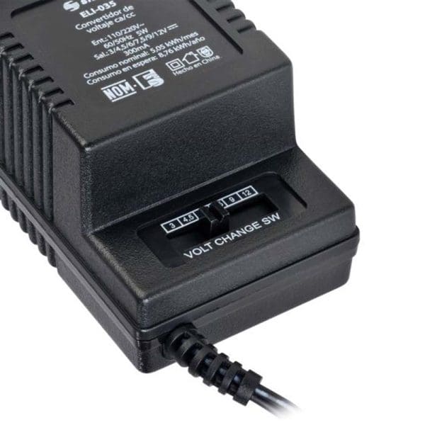 Convertidor de voltaje o eliminador de baterías, con adaptador intercambiable de 6 conectores desprendibles y salida variable de 3 / 4,5 / 6 / 7,5 / 9 / 12 Vcc. Se utiliza para juguetes, calculadoras, radios portátiles, entre otros
