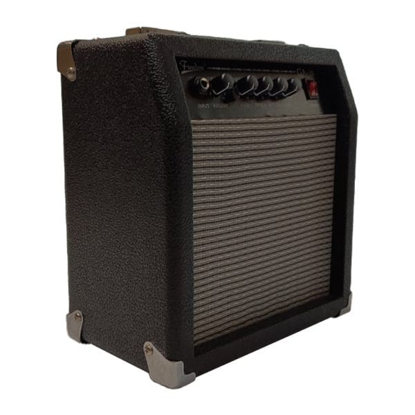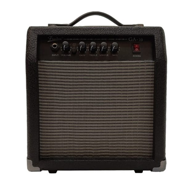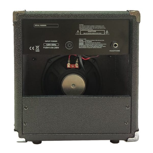 Amplificador de 15W ideal para ensayos y prácticas en casa. Cuenta con un altavoz de 6″, ecualización de 3 bandas, control de volumen y ganancia, entrada para guitarra eléctrica y salida para auriculares. Diseño compacto y portátil.