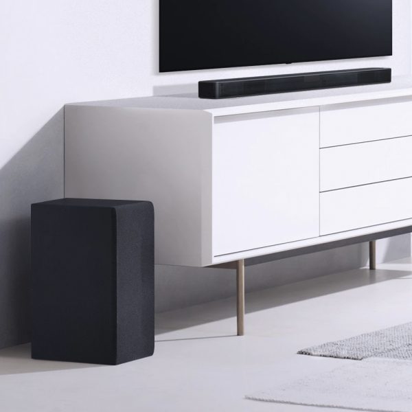 El potente subwoofer inalámbrico de la Barra de Sonido LG SL4 es fácil de instalar, proporcionando 200 vatios adicionales.