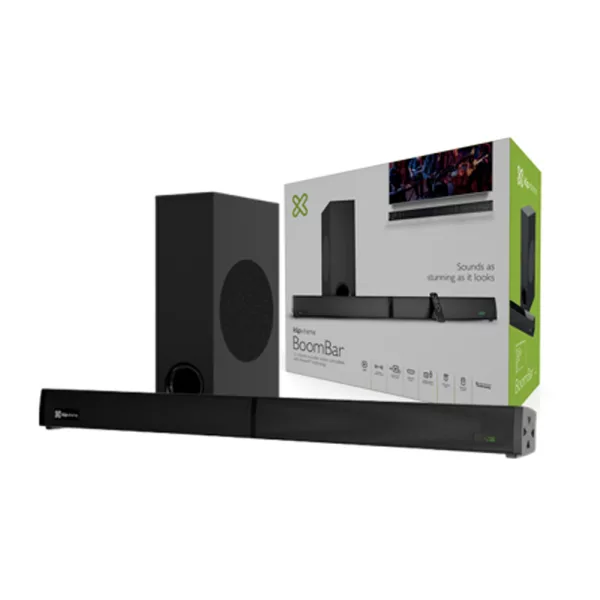 Disfruta de un sonido potente y claro con la barra de sonido BoomBar de KlipXtreme. Este sistema estéreo 2.1 ofrece 160 watts de potencia a través de cuatro altavoces de rango medio y un parlante de bajos. Con tecnología Bluetooth® v5.0, puertos HDMI® ARC y óptico digital, y un diseño versátil para instalación en plataforma plana o pared, es la opción perfecta para tu entretenimiento en casa