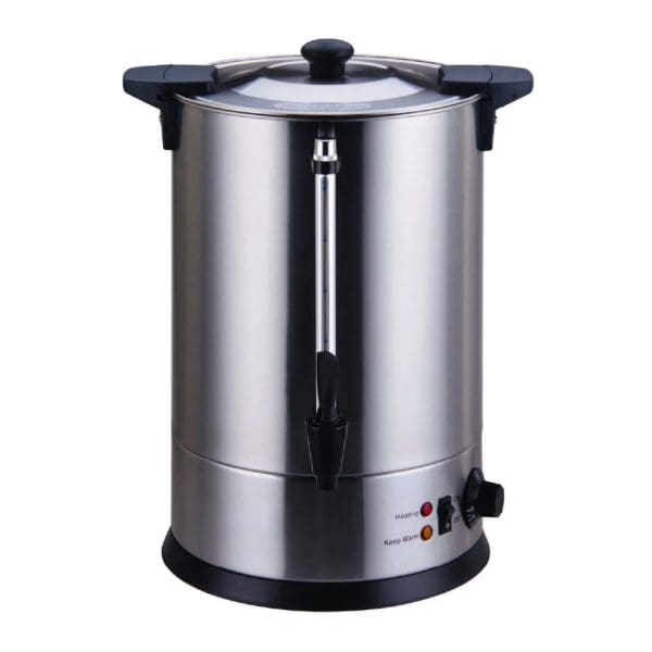 La cafetera industrial eléctrica Warenhaus CuD180, con capacidad para 60 tazas, está fabricada en acero inoxidable de alta calidad. Su función automática asegura que el café se mantenga caliente y conserve su sabor y aroma. Cuenta con filtro permanente, indicador de nivel de agua y asas resistentes al calor, ofreciendo durabilidad y comodidad en su uso