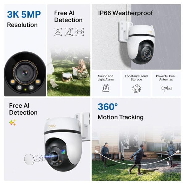 La Tapo C530WS es una cámara de vigilancia Wi-Fi para exteriores con resolución 3K 5MP, cobertura panorámica de 360° y detección inteligente por IA. Ofrece visión nocturna en color Starlight, seguimiento automático de movimiento, alarma de luz y sonido, y resistencia IP66, brindando seguridad continua y confiable las 24 horas del día.