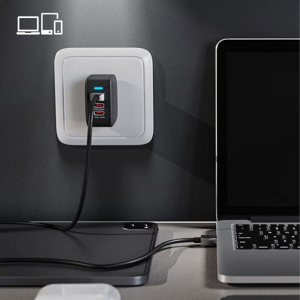 Suficiente para cargar portátiles, estaciones de acoplamiento, hubs, auriculares y altavoces portátiles con una sola solución compacta.