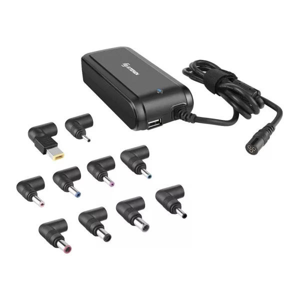 El cargador universal de 90 watts es ideal para reemplazar cargadores dañados o extraviados de laptops. Con 10 puntas intercambiables y protección contra sobrecarga, garantiza la alimentación segura y correcta para una variedad de modelos. Incluye un puerto USB adicional para cargar dispositivos móviles y está fabricado con plástico ABS resistente al impacto