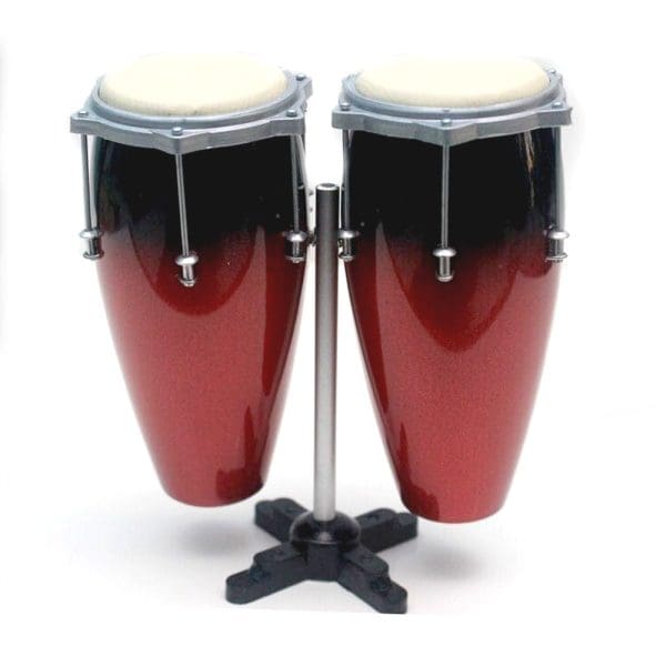 Estas congas en miniatura destacan por su acabado rojo brillante, capturando la energía y el ritmo del estilo musical latino.
