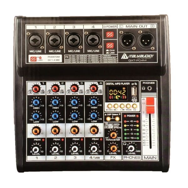 Mezclador de audio de cuatro canales con fuente de alimentación USB 5v.