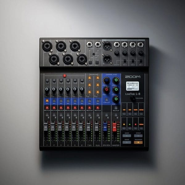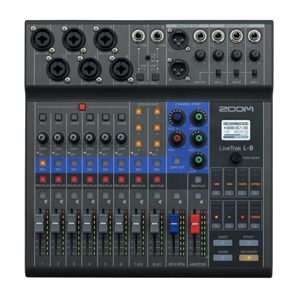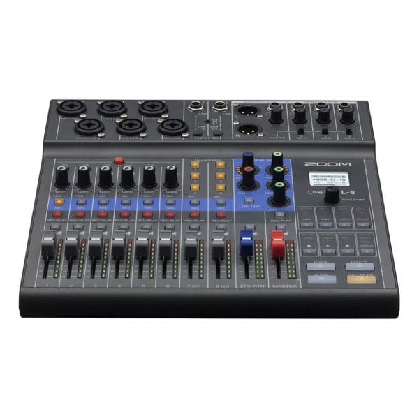 La mezcladora de 8 canales (6 combo, más 2 TS) Livetrack L-8 permite la grabación simultánea de 12 pistas y reproducción de 10 pistas. Grabe hasta 24 bits / 96 kHz y, en la computadora y la tarjeta SD simultáneamente, hasta 48 kHz. Además, se puede usar como interfaz de audio USB de 12 entradas / 4 salidas. Asimismo, cuenta con ecualizador de 3 bandas, función de corte de graves, función Mix-Minus que evita la retroalimentación de audio de los invitados que llaman, 7 memorias de escena para almacenar mezclas, 6 Sound pads asignables y 4 salidas de auriculares, que constan de 3 mezclas de monitorización personalizadas, más una mezcla principal. También, tiene compatibilidad con iOS