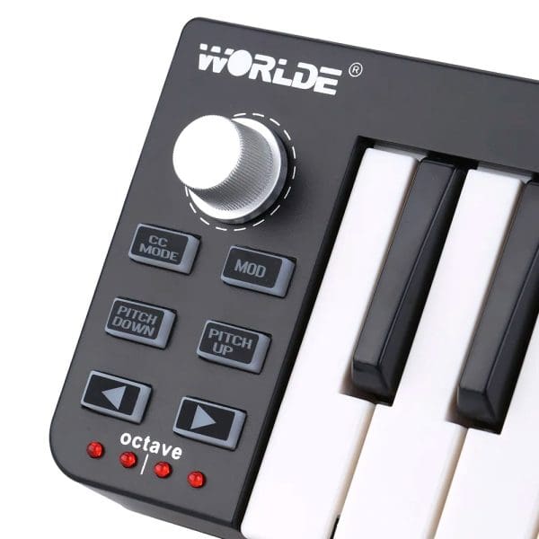 Incluye control de octava y pitch bend para ajustar la tonalidad en tiempo real.