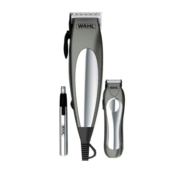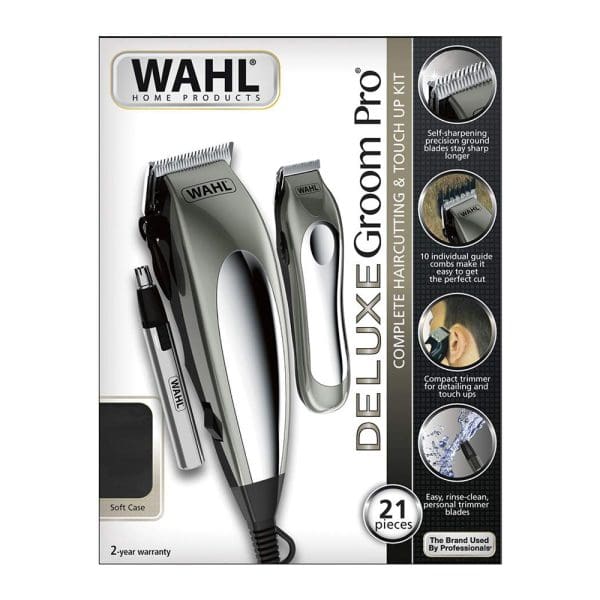 El Combo Cortadoras De Cabello Wahl Deluxe Groompro 21 Piezas incluye un cómodo mango con control de largo ajustable para manejar la cortadora con facilidad, una cortadora mini sin cable para retoques y exclusivos accesorios Wahl.