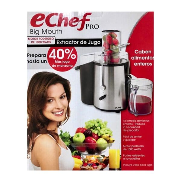 El Extractor de Jugos Echefpro es un exprimidor potente y eficiente, con un motor de 700 watts y compartimiento extra grande para frutas y verduras enteras. Sus cuchillas de acero inoxidable, 2 velocidades, y sistema de seguridad con palanca de bloqueo, facilitan la preparación de jugos frescos y saludables. Incluye jarra de 1 litro, cepillo de limpieza y manual en español