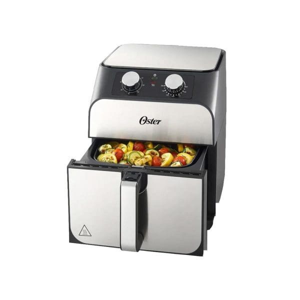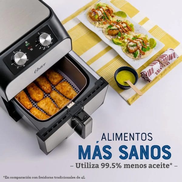 La freidora de aire Oster® hace que el aire caliente circule a una velocidad ultra rápida por el interior del equipo, cocinando los alimentos y produciendo una capa crujiente utilizando un 99.5% menos aceite.