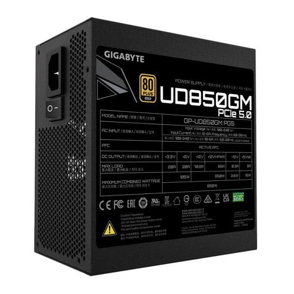 La fuente de poder Gigabyte GP-UD850GM PG5 de 850W con certificación 80 PLUS Gold ofrece una eficiencia del 90% y un rendimiento superior. Equipado con soporte para tarjetas gráficas PCIe Gen 5.0 y un conector nativo de 16 pines, proporciona hasta 600W para gráficos avanzados. Su diseño Ultra Durable incluye condensadores japoneses, una solución térmica mejorada y un ventilador hidráulico de 120 mm que asegura un funcionamiento silencioso. Con protección integral y diseño modular, esta fuente es ideal para configuraciones de alto rendimiento y garantizan estabilidad y fiabilidad