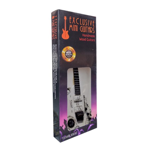 Fabricada con materiales duraderos y acabados detallados, esta mini guitarra es una representación fiel del icónico instrumento utilizado por Kirk Hammet.