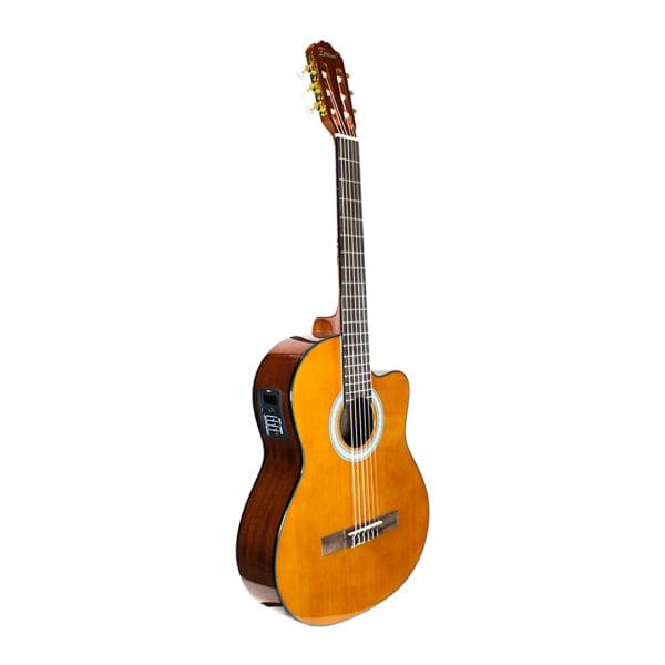 La Ferredom CG610CEQ/N es una guitarra electroacústica de 39″ con diseño Cuyaway. Destaca por su sonido equilibrado y cálido, construcción de calidad con maderas seleccionadas, acabado brillante natural y sistema de pastillas/preamplificador para amplificación. Es cómoda, versátil y adecuada para músicos de todos los niveles