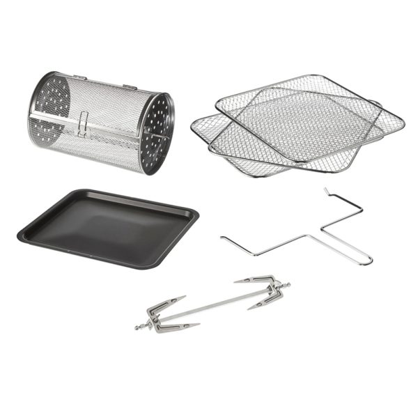 - Incluye 3 bandejas de malla, canasta giratoria, bandeja de goteo / para hornear, elevador de canasta / asador y accesorios para asador