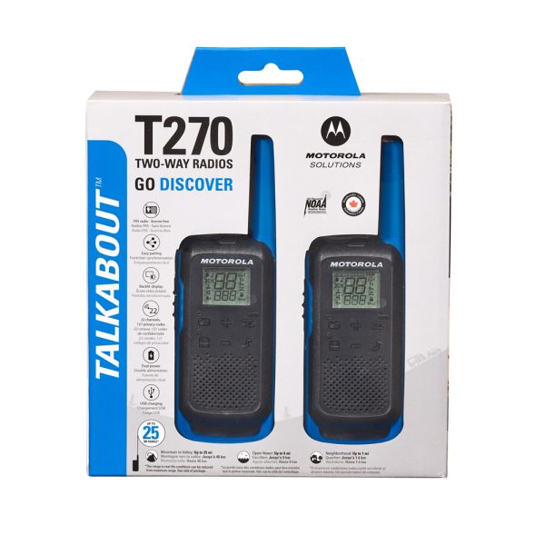 Con todas las funciones, resistente y con mucho estilo, el walkie-talkie TALKABOUT T270 es la mejor manera de mantenerse conectado durante sus aventuras al aire libre. En casa, en un camping, en una fiesta o simplemente durante una caminata, el TALKABOUT T270 lo mantiene en contacto. Viene con botón de emparejamiento simplificado y carga USB para un nivel de practicidad sin precedentes. No requiere licencia e incluye características clave tales como pantalla LCD, 22 canales y un alcance de hasta 40 km*, sin cargos por llamada.