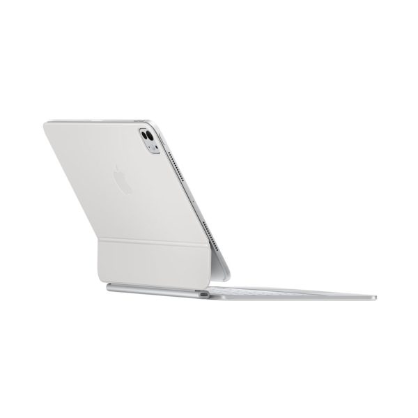 El teclado Magic Keyboard en color negro aporta una experiencia de escritura precisa con teclas retroiluminadas, fila de 14 teclas de función y trackpad de vidrio con respuesta háptica. Su diseño flotante de aluminio permite ajustar el ángulo de visión y se pliega para proteger el iPad por ambos lados.