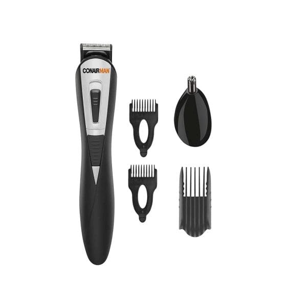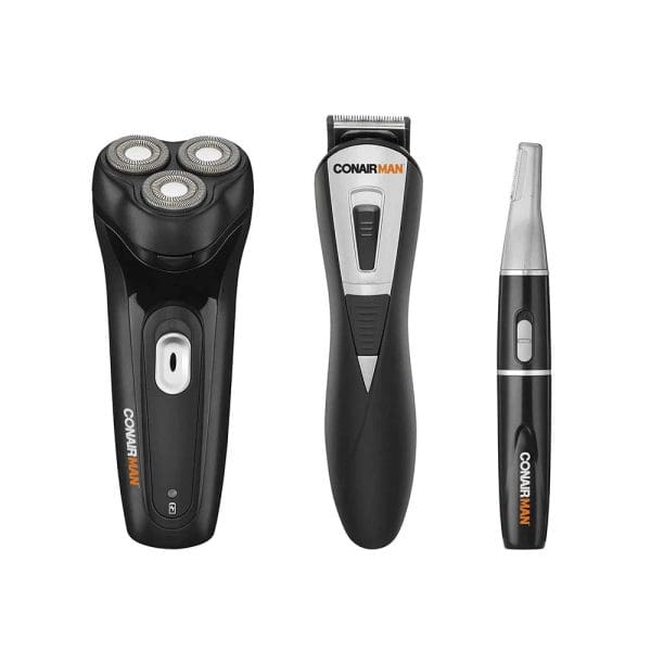 Kit de cuidado total Conair para barba y bigote; el rostro de un hombre es su reflejo, algunas veces audaz, algunas veces gentil pero siempre único, toma tu tiempo y utiliza la mejor máquina. 10 piezas: Rasuradora giratoria, recortadora para barba y bigote, 3 peines para la barba, 1 peine con 6 posiciones de corte, recortadora personal, 2 peines para detallar, 1 estuche de almacenaje de lujo.