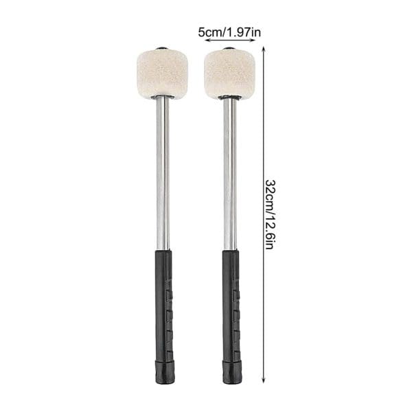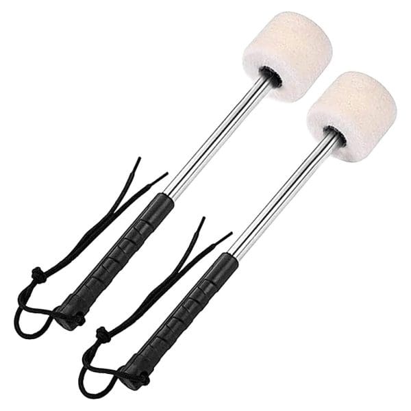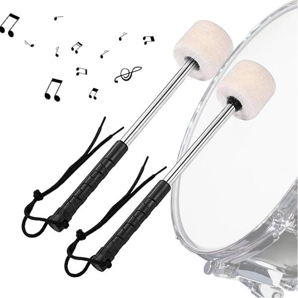Par de mazos de 32 cm diseñados para bombos y tambores, con mango metálico que ofrece gran durabilidad y firmeza en la ejecución. Ideales para bandas de guerra y ensambles de percusión que buscan un sonido fuerte y consistente.