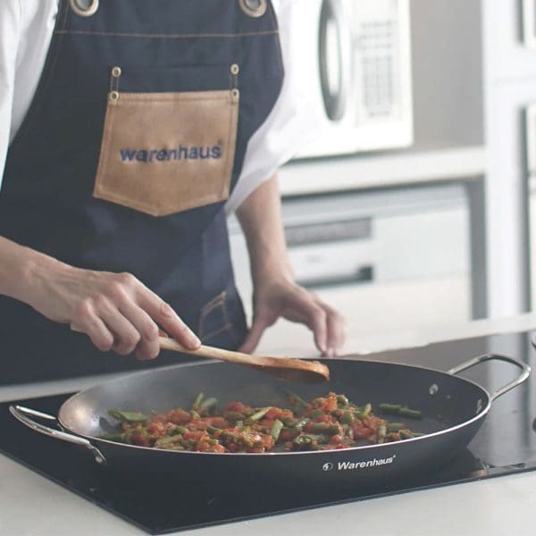 Paellera Warenhaus de 34 cm y 2.8 litros, fabricada en aluminio laminado con recubrimiento antiadherente y asas de acero cromado. Ideal para preparar paellas y platos grandes, compatible con cocinas de gas, eléctrica, cerámica e inducción. Cocina perfecta con distribución uniforme del calor y fácil limpieza.