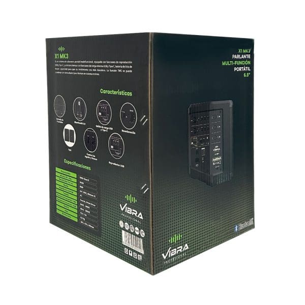 El VIBRA X1 MK3 es un sistema de sonido profesional portátil y recargable, diseñado para músicos, DJs y eventos en general. Su diseño compacto, resistente y de alto rendimiento ofrece una calidad de audio clara y potente, ideal para presentaciones tanto en interiores como exteriores.