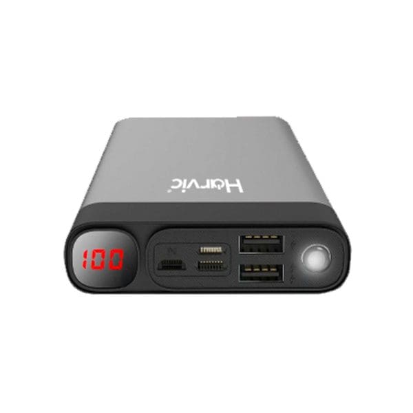 Power Bank Harvic PB-604 de 20,000 mAh, con doble puerto USB y carga rápida de 5V-2.1A. Ideal para cargar hasta dos dispositivos a la vez.