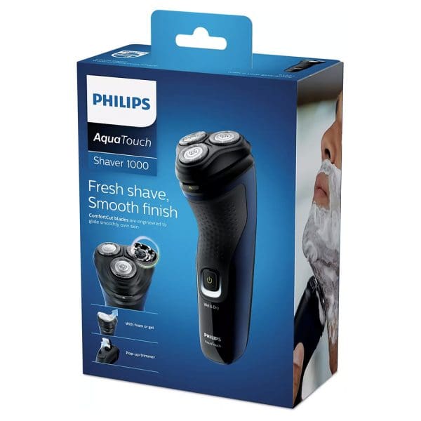 La afeitadora Philips AquaTouch 1000 te ofrece un afeitado asequible, suave y refrescante en seco o en húmedo con cuchillas ComfortCut autoafilables.