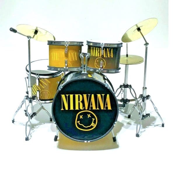 Esta mini batería homenajea a Nirvana, capturando la esencia de la banda y su impacto en la música grunge.
