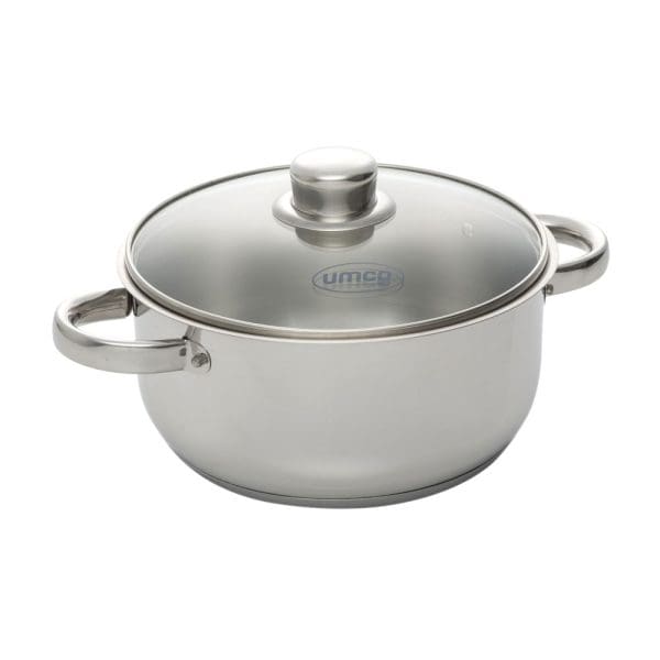 El modelo 7559 Set Brillance de UMCO está fabricado completamente en acero inoxidable, incluyendo sus mangos, asas y tapas de vidrio templado. Esto garantiza una larga vida útil, resistencia a la corrosión y una excelente apariencia en tu cocina.