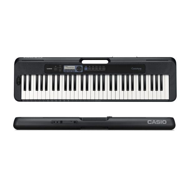 Con el CT-S300, puede disfrutar de la música en cualquier momento y lugar. Su tamaño compacto de 930 mm x 256 mm x 73 mm es un 30 % más pequeño en volumen que el modelo CTK-3500 y su batería alcalina cuenta con aproximadamente 19 horas de duración*. Llevarlo es muy sencillo, gracias a un mango en la parte superior del teclado y un peso de solo 3,3 kg. El diseño incorpora bordes y esquinas redondeados, lo cual permite transportarlo con seguridad.