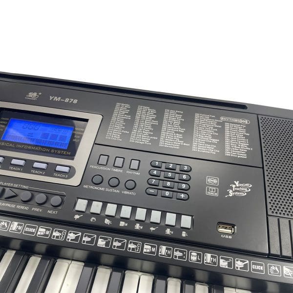 El Yongmei YM-878 es un teclado electrónico diseñado para ofrecer una experiencia musical completa y accesible. Ideal para músicos principiantes y aficionados, combina una variedad de funciones que facilitan el aprendizaje y la interpretación. Su diseño portátil lo hace perfecto para uso en casa, clases de música o presentaciones informales.