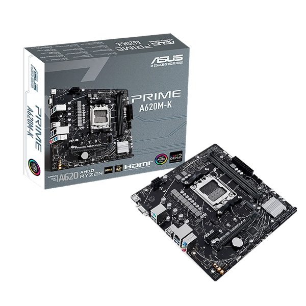 La ASUS PRIME A620M-K está diseñada para liberar todo el potencial de los procesadores AMD Ryzen™ serie 7000/8000. Ofrece conectividad ultrarrápida, sonido y rendimiento optimizados, enfriamiento inteligente y compatibilidad con memoria DDR5. Ideal para equipos modernos que buscan estabilidad, eficiencia y personalización con iluminación Aura Sync.