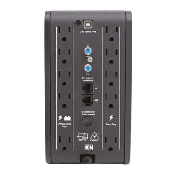 Cantidad de tomas: 10 salidas NEMA 5-15R (5 con respaldo de batería y regulación AVR + 5 con supresión de picos)