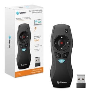 Haz que tus presentaciones sean más dinámicas y profesionales con el control inalámbrico Steren COM-5604. Combina apuntador láser, Air Mouse, marcador y control de volumen en un diseño ergonómico y portátil.